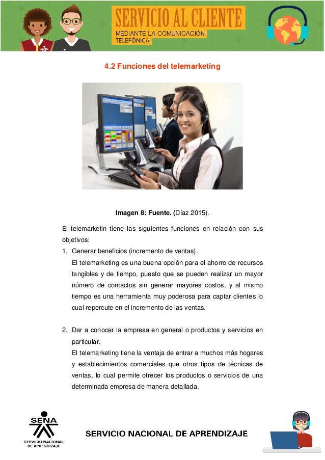 Aunque hay ms como vamos a comprobar. 11 Cntrate en el cliente. Por ejemplo mientras que el trabajo de un operador de televentas sera cerrar la venta por telfono el trabajo de un operador de telemercadeo sera reservar obtener informacin dar informacin hacer.