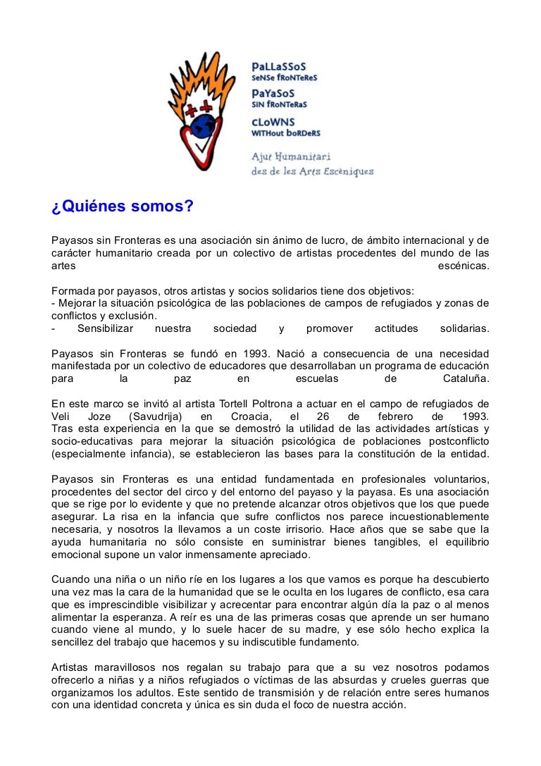 Vdeo resumen de las expediciones realizadas durante 2017. Naci a consecuencia de una necesidad manifestada por un colectivo de educadores que desarrollaban un programa de educacin para la paz en escuelas de Catalua. PAYASOS SIN FRONTERAS CONCLUSIONES Nosotros hemos tomado como conclusion de que esta ONG suele actuar con el mismo objetivo que es sacar sonrisas a sus espectadores y trabajan sin animo de lucro.